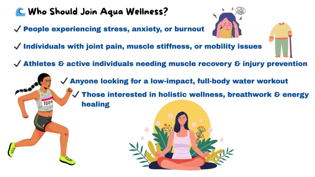Aqua Wellness is a revolutionary water-based wellness program that blends: ✔ Swimming techniques to enhance movement, breath control & endurance ✔ Hydrotherapy exercises to improve joint mobility & muscle recovery ✔ Breathwork & floating meditation for deep relaxation & stress relief ✔ Energy healing in water to balance mind, body & soul